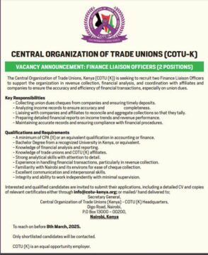 The Central Organization of Trade Unions, Kenya (COTU-K), is hiring! We are looking for two Finance Liaison Officers to support revenue collection, financial analysis, and coordination with affiliates and companies.